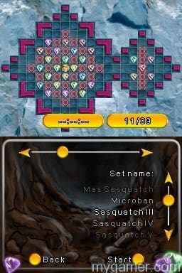 There are dozens of similar crate pushing games like Sokoban and Chip’s Challenge but this DSiWare downloadable title differs from the rest by having the player push gems instead of crates or boxes. The goal is simple, move a bunch of gems from their starting position through a maze without getting stuck. Each level is either very easy or very challenging (but mostly challenging). Yes, there are hundreds of levels in this low price download but most gamers will not feel the need, or have the tenacity, to complete more than a dozen of them.